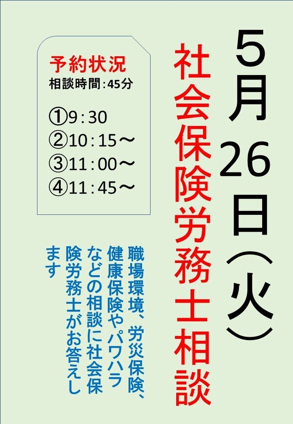 労災保険、健康保険やパワハラなどの相談に、